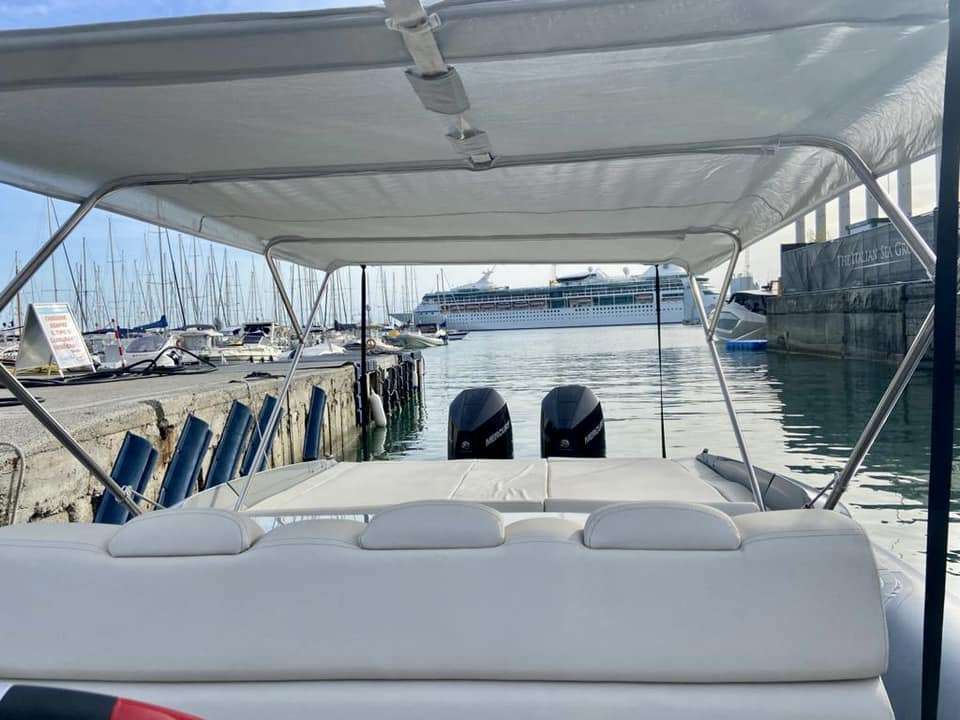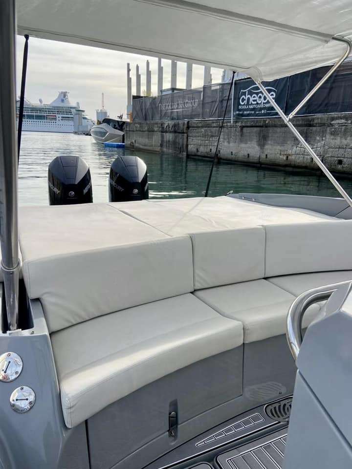 La poppa è dotata di un prendisole che accoglie comodamente fino a 4 persone e un gavone di poppa che può essere trasformato in una cabina con 3 posti letto. Un tendalino parasole copre tutta la zona di poppa fino alla console, offrendo protezione e comfort.